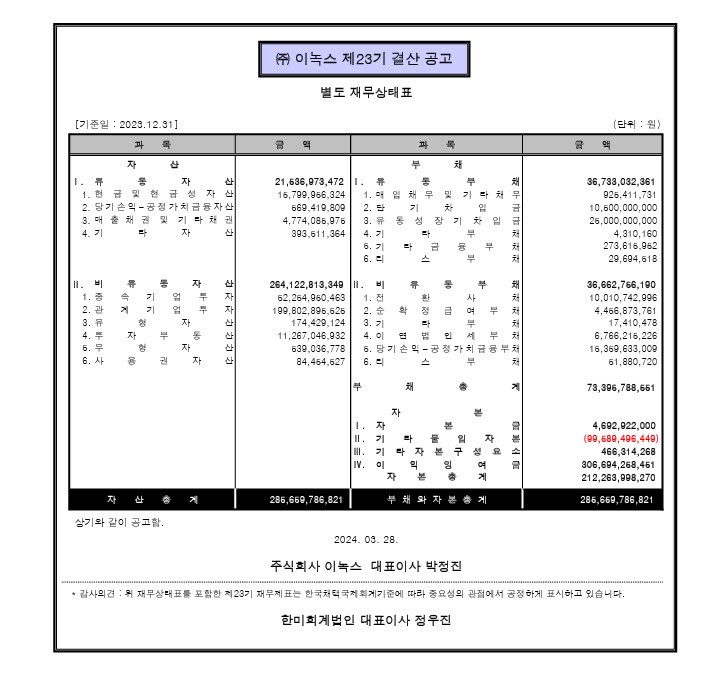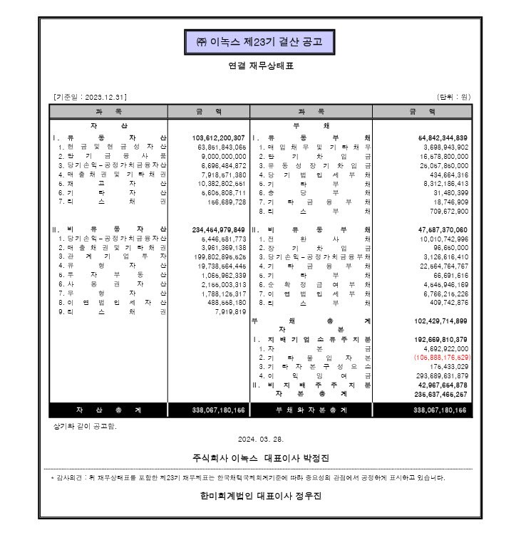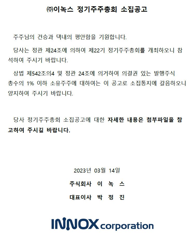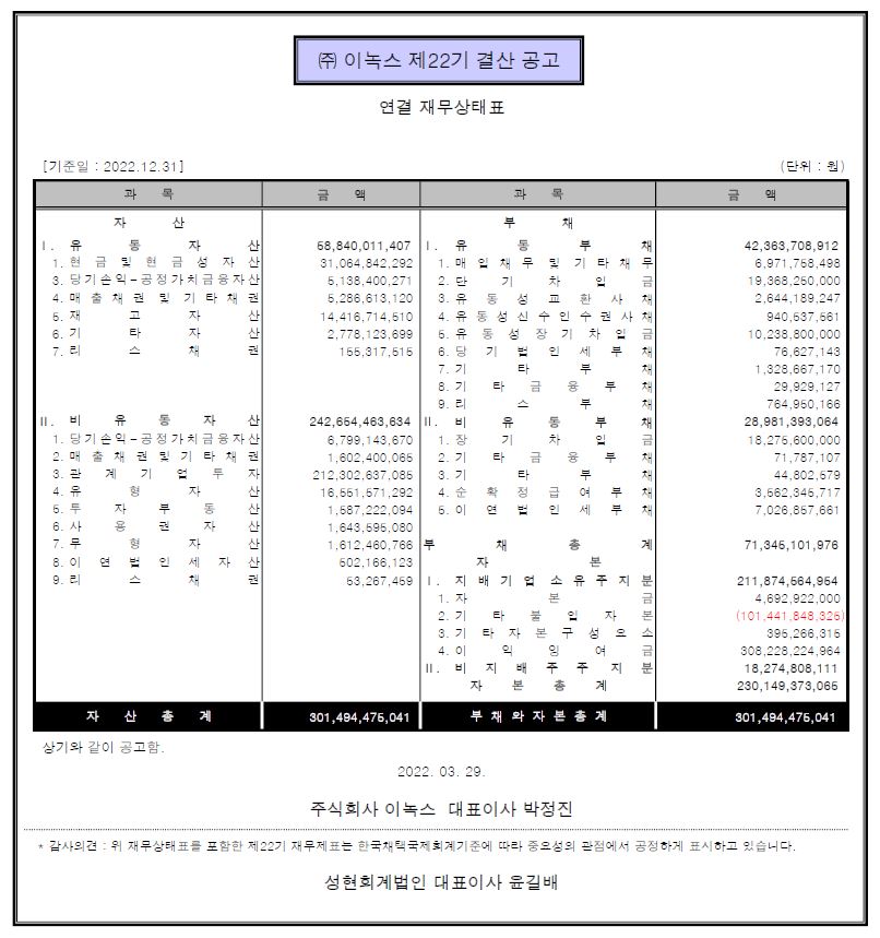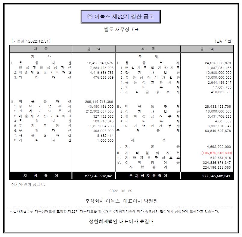 2023.03.29 제22기 ㈜이녹스 결산공고 첨부파일 당사 정관 제 4조 및 제 52조 4항에 의거 재무상태표와 감사의견을 다음과 같이 공고하오니, 참고하시길 바랍니다.상세내용 : 펼치기