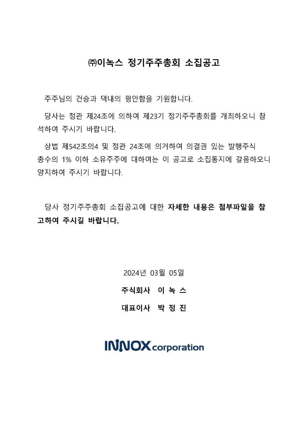 2024.03.20 ㈜이녹스 제23기 사업보고서 첨부파일 「상법」 제542조의4 및 「상법 시행령」 제31조4항4호에 따른 사업보고서 및 감사보고서를 홈페이지에 게재합니다.사업보고서감사의 감사보고서내부감시장치에 대한 감사의 의견서정관영업보고서내부회계관리제도 운영보고서연결감사보고서별도감사보고서